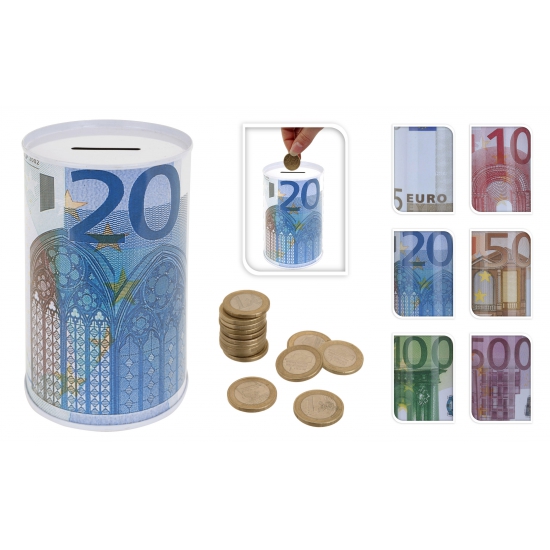 100 euro biljet spaarpot 13 cm. Deze metalen blikspaarpot heeft een opdruk van een 100 euro biljet. De spaarpot dient u met een blikopener te openen. Afmeting: ca. 8 x 13 cm.