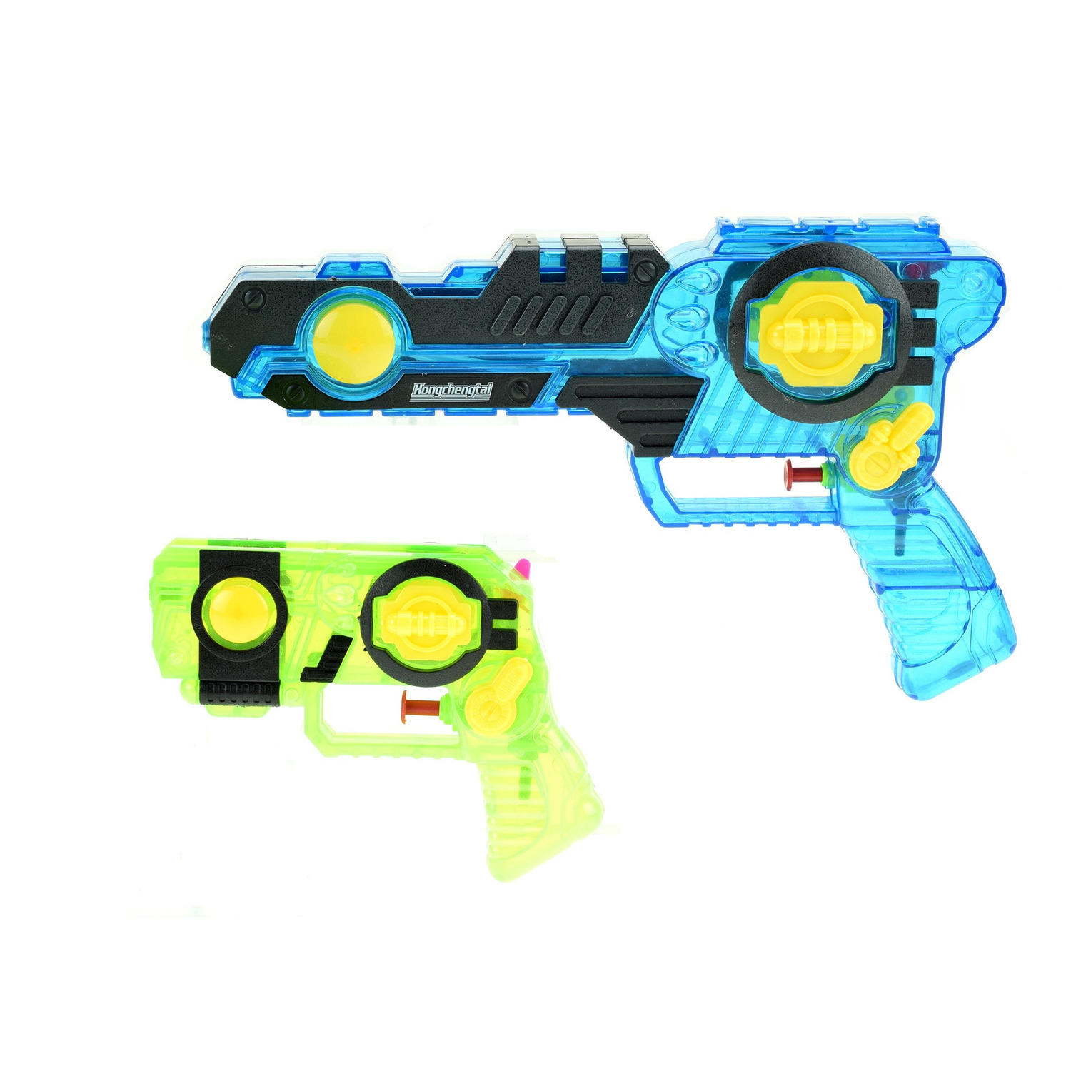 1x blauw/groene waterpistolen/waterpistool 2-delig met een dubbele straal. Deze stoere waterpistolen kunnen op twee manieren gebruikt worden. Er kunnen twee enkele waterpistolen van gemaakt worden, of een dubbele straal door middel van het kleine waterpistool op het grote waterpistool te klikken. Het waterpistool is in het blauw/groen verkrijgbaar. Materiaal: kunststof. Afmeting grootste waterpistool: Lengte ca 26 cm. U ontvangt 2 waterpistolen welke op elkaar gemonteerd kunnen worden. Waterspeelgoed van kunststof. Kinderspeelgoed voor buiten.