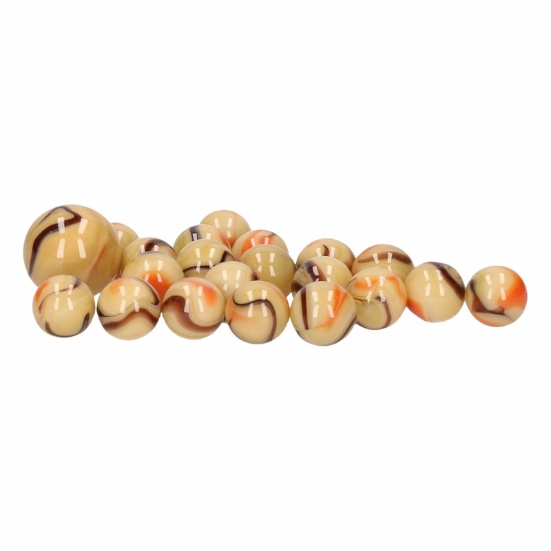 21x Knikkers Sandy Giraffe in netje. 20 stuks Sandy Giraffe knikkers plus 1 extra grote shooter knikker in een netje. Materiaal: Glas. Buitenspeelgoed – Knikkeren.