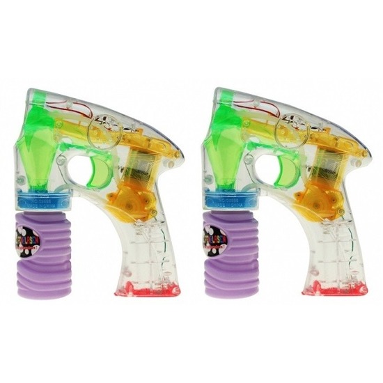 2x Bellenblaas pistool met LED licht. Deze leuke bellenblaas in de vorm van een pistool wordt geleverd inclusief 3 AA batterijen en een flesje bellenblaas. Het pistooltje maakt geen geluid en heeft een afmeting van ongeveer 12 x 14 cm. U ontvangt 2 stuks. Bellenblaas pistolen fun buitenspeelgoed.
