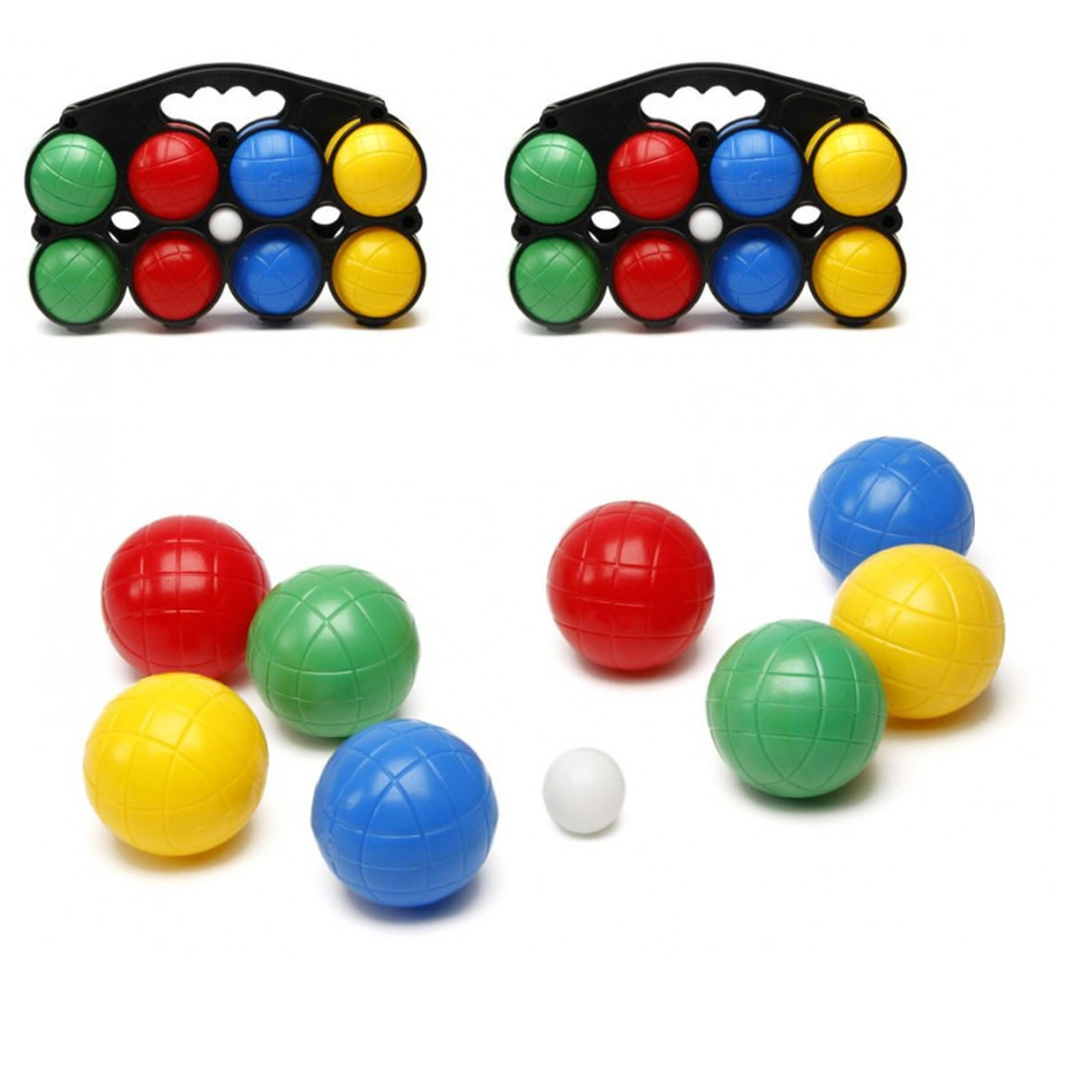 2x Jeu de boules sets. Deze jeu de boules sets bevat 16 kunststof ballen en 2 kleine balletjes. De ballen hebben 4 verschillende kleuren, waardoor iedere speler een eigen kleur heeft en goed te zien is welke bal van wie is.