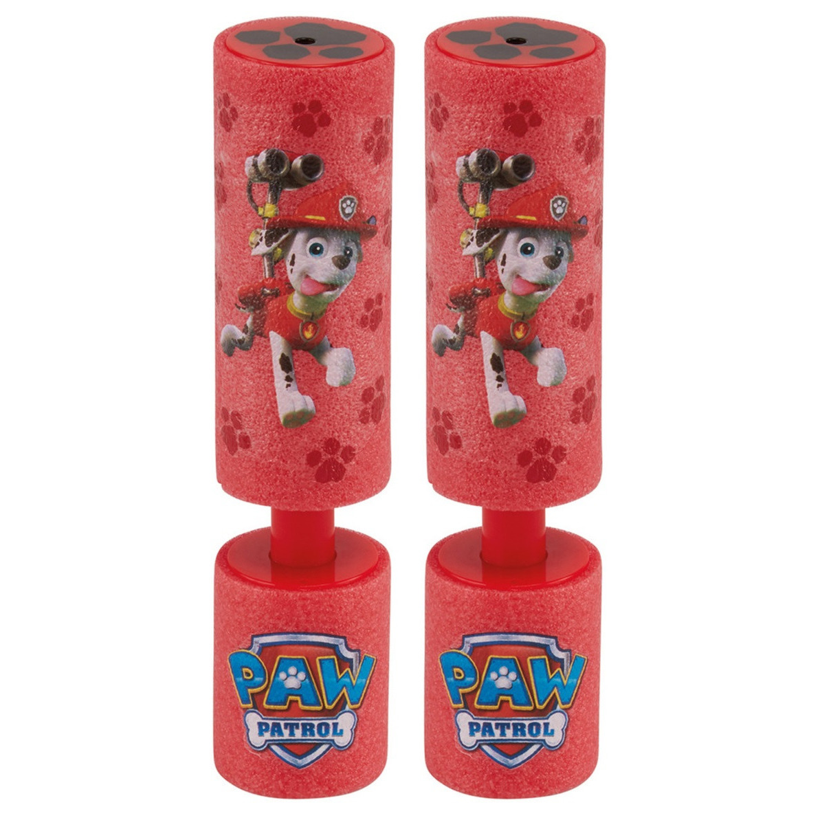 2x Paw Patrol waterpistool/waterpistolen van foam rood 15 cm. Een rood foam waterpistool met opdruk van Marshall uit Paw Patrol. Dit waterpistool vult u onder de kraan met water. Hierna haalt u de achterkant van het foam pistool naar achter, met kracht duwt u deze terug. Hierdoor krijgt u een krachtige waterstraal die wel tot 6 meter ver kan spuiten. Formaat: ongeveer 15 cm, diameter 4 cm. Zomer waterspeelgoed/buitenspeelgoed. Inhoud: 2x.