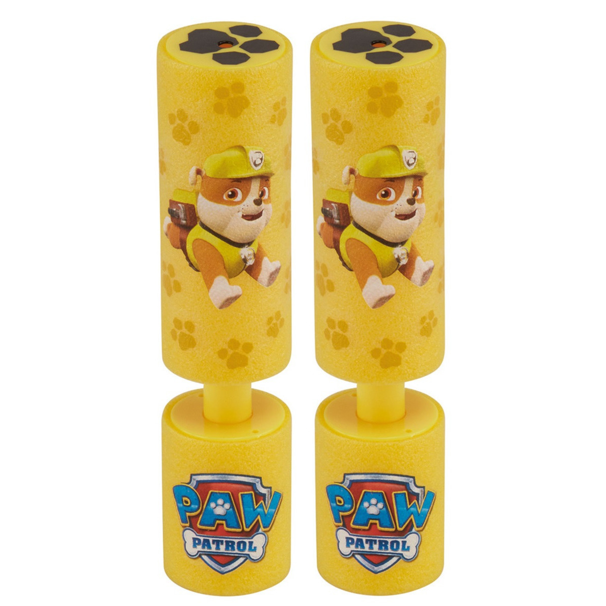 2x Paw Patrol waterpistool/waterpistolen van foam geel 15 cm. Een geel foam waterpistool met opdruk van Rubble uit Paw Patrol. Dit waterpistool vult u onder de kraan met water. Hierna haalt u de achterkant van het foam pistool naar achter, met kracht duwt u deze terug. Hierdoor krijgt u een krachtige waterstraal die wel tot 6 meter ver kan spuiten. Formaat: ongeveer 15 cm, diameter 4 cm. Zomer waterspeelgoed/buitenspeelgoed. Inhoud: 2x.