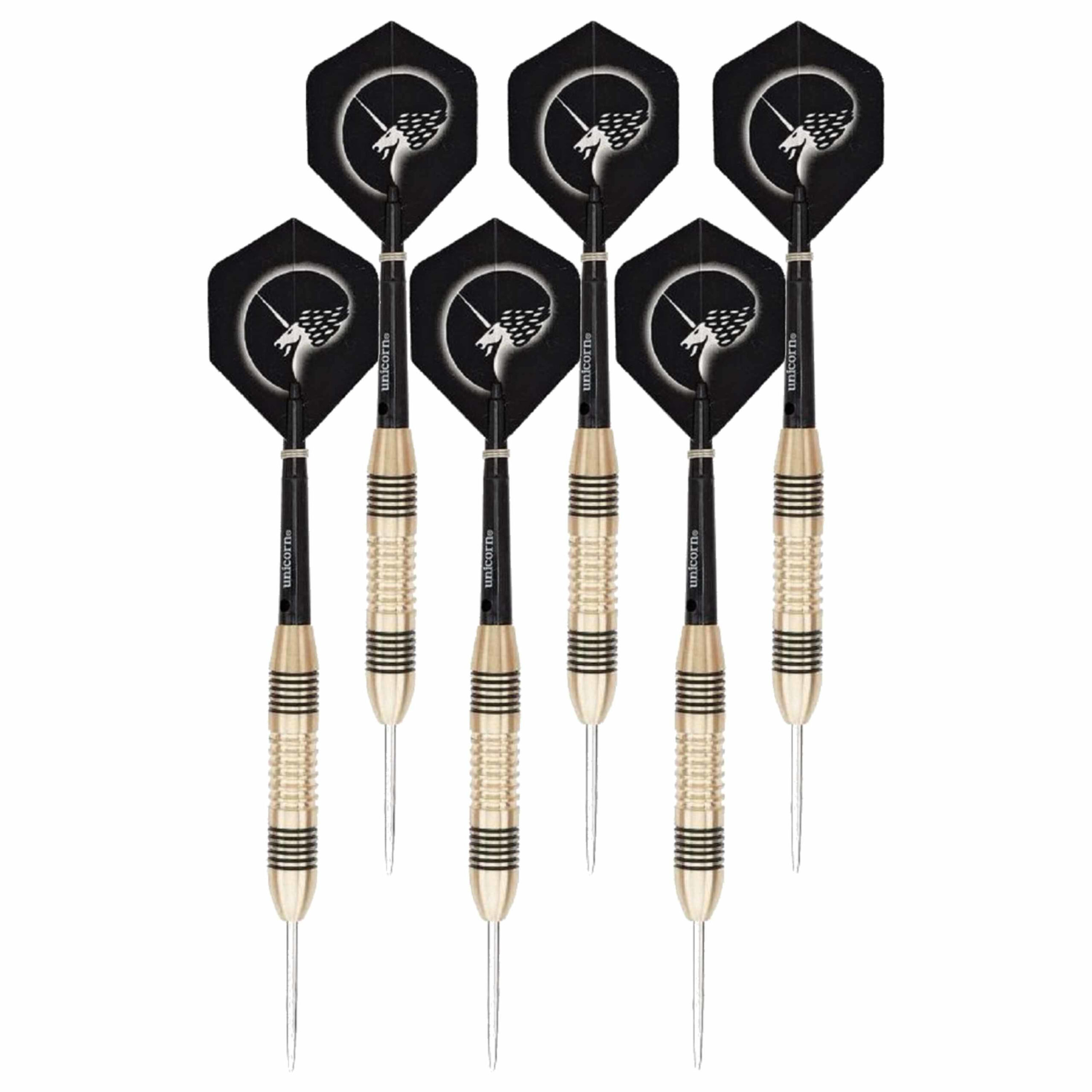 2x Set van 3 dartpijlen Core Brass 25 grams. 2x set van 3 dartpijlen met een messing (Brass) barrel, een PVC shaft, stalen punt en wordt standaard geleverd met Unicorn flights. Een set bevat 3 complete darts. U ontvangt 2x sets.