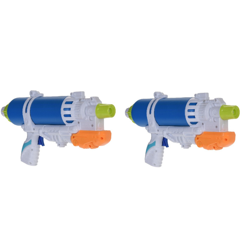 2x Blauw/wite waterpistolen/waterpistool 34 cm. Afmeting: L34 x B8 x H21 cm. Materiaal: kunststof. U ontvangt 2 waterpistolen. Waterspeelgoed van kunststof. Kinderspeelgoed voor buiten.