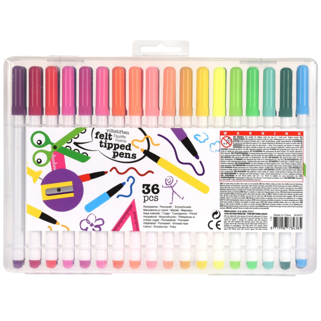 36x Viltstiften in diverse kleuren. Gekleurde stiften in box voor kinderen.
