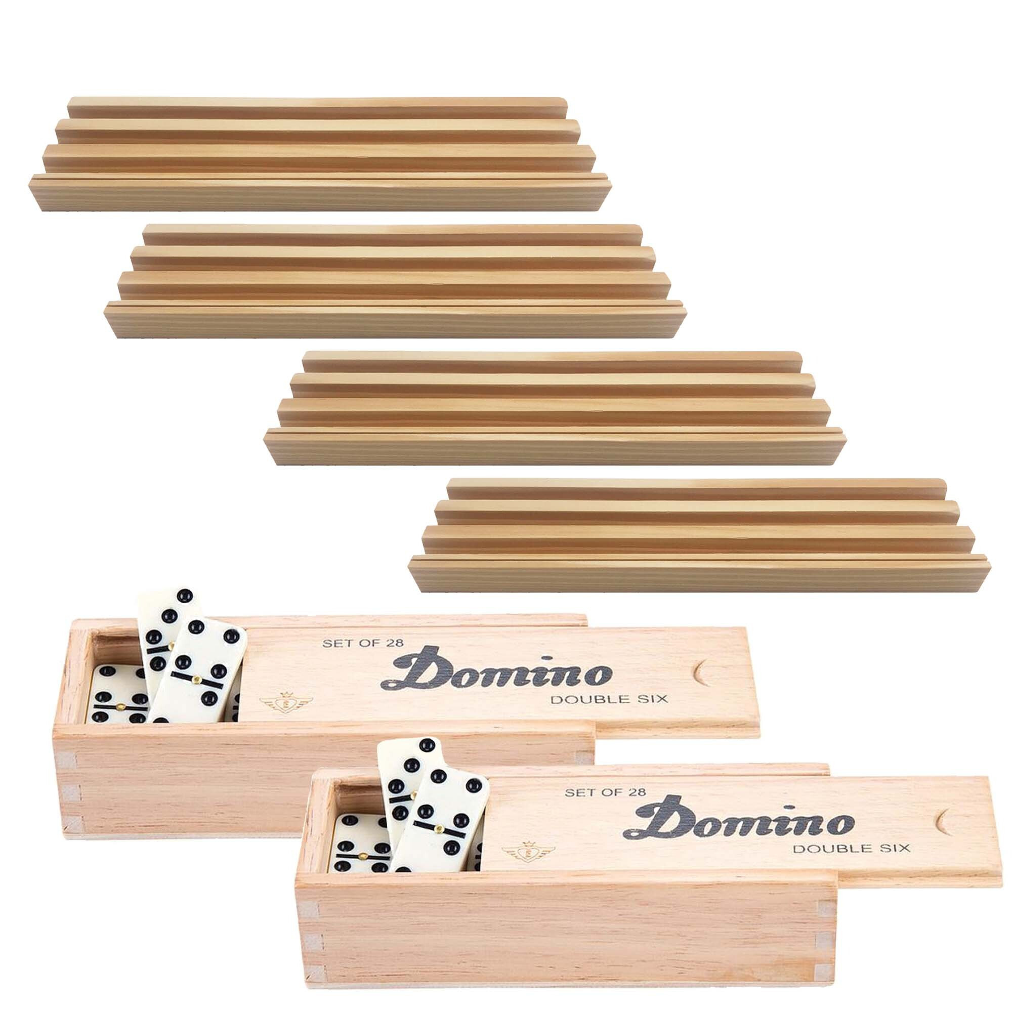 4x Dominostenenhouder met 2x domino spel dubbel/double 6 in houten doos 28x stenen. Dus in totaal ontvangt u 56x dominostenen. De houders zijn gemaakt van hout en de dominostenen van kunststof. Formaat dominosteenhouders: ca. 26 x 6 x 1,5 cm. , Dit artikel bestaat uit:, 2x Dominospel – dubbel/double six – hout/ kunststof – 28x stenen – dominostenen – spelletjes, 1x 4x Speelkaarten / dominostenen houder – hout – 26 x 6 x 1,5 cm