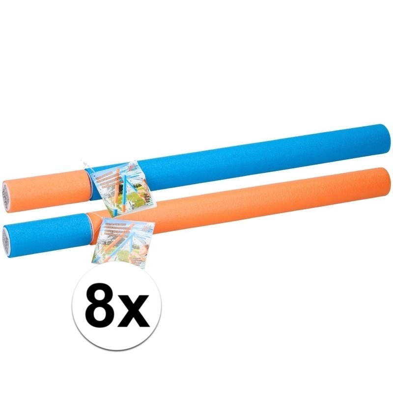 8x Waterpistolen van foam 54 cm. Dit waterpistool vult u onder de kraan met water. Hierna haalt u de achterkant van het foam pistool naar achter, met kracht duwt u deze terug. Hierdoor krijgt u een krachtige waterstraal die wel tot 6 meter ver kan spuiten. Formaat: ongeveer 54 cm. U ontvangt een willekeurige kleur.