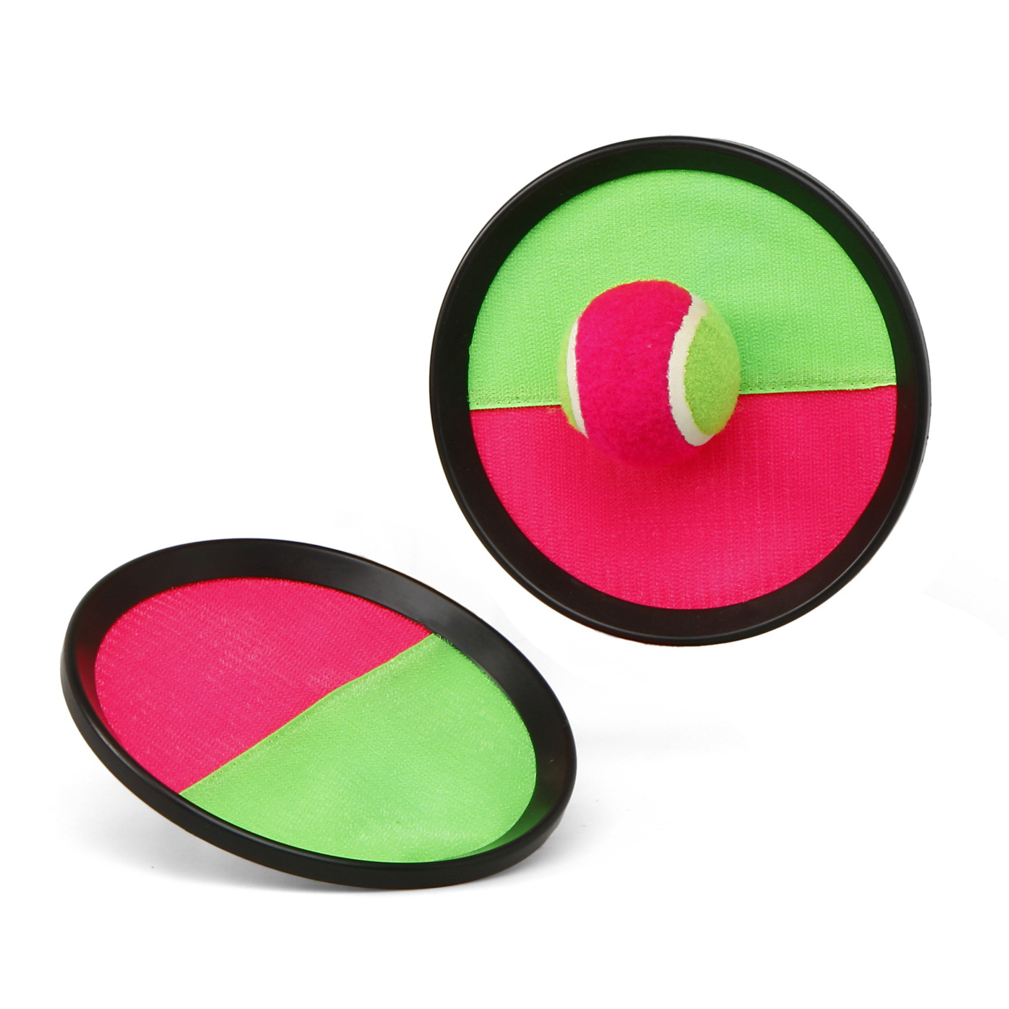 Strand vangbal spel met klittenband. Gooi over met dit vangbal spel. Door het klittenband blijft de bal plakken. Aan de achterkant zit een band om je hand vast te maken. Formaat: dia 19 cm. Materiaal: Kunststof. Kleur: Roze/groen. Beachball vangbal setje buitenspeelgoed voor op het strand of de camping.