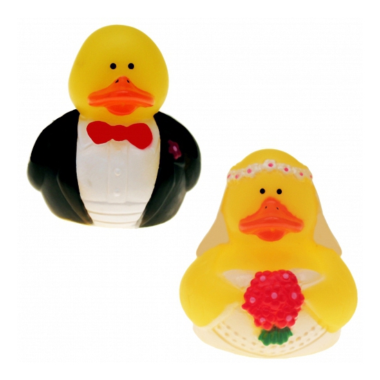 Bruid en bruidegom badeendjes. Badeendjes die aangekleed zijn als bruid en bruidegom. Leuk voor de kleine in bad, maar natuurlijk ook voor de verzamelaar! Geschikt voor kinderen vanaf 1 jaar! Ongeveer 5 cm groot. , Dit artikel bestaat uit:, 1x Bruidegom badeendje – rubber – 5 cm – Huwelijk/bruiloft cadeau, 1x Bruid badeendje – rubber – 5 cm – Huwelijk/bruiloft cadeau