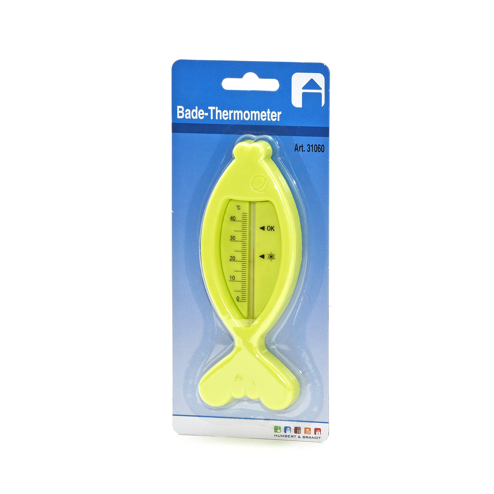 Bad/Water/zwembad thermometer Fish, gemaakt van kunststof, met afmetingen 15 x 5 cm, in kleur geel. Drijvende thermometer. De drijver is voorzien van een water thermometer, welke de temperatuur in zowel Fahrenheit als Celsius aangeeft.