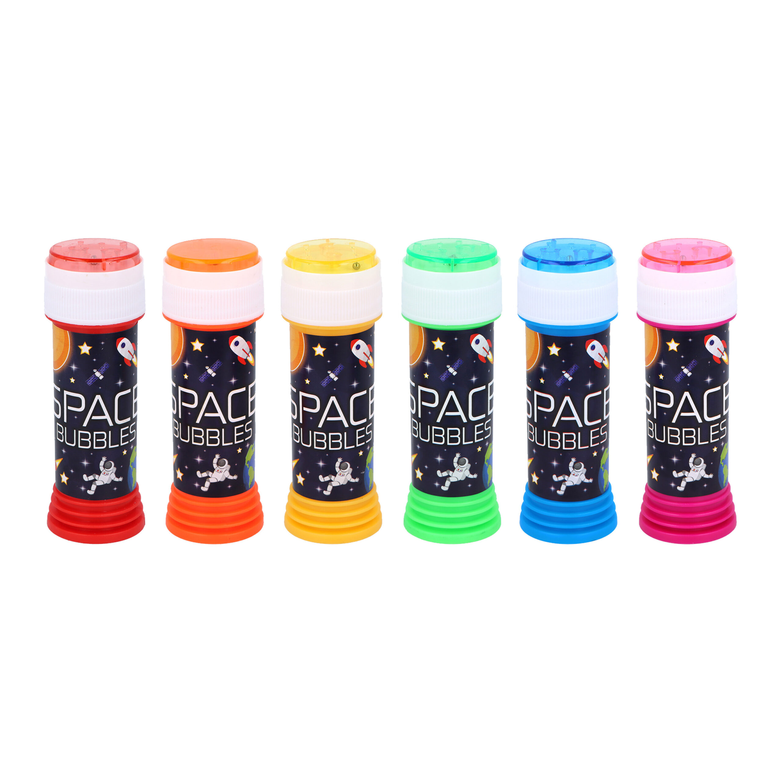 Bellenblaas met thema ruimte/ruimtevaart. De bellenblaas heeft een inhoud van 50ml. In de deksel zit een bal spelletje, leuk voor kinderen om met de bellenblaas te spelen en het spelletje in de dop. Een bellenblaasflesje met opdruk van de ruimte met planeten, sterren en astronaut. Een leuk item voor een grabbelton of om uit te delen met een kinderfeestje of trakteren op school. Je ontvangt een willekeurige kleur/opdruk, dit kunnen dezelfde zijn maar ook verschillende. Materiaal flesje: kunststof. Inhoud: ca. 50 ml. Thema: ruimte/ruimtevaart/planeten/sterren/astronauten.