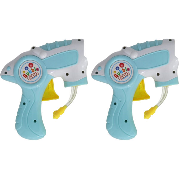 2x bellenblaas pistool met 2 vullingen in de kleur lichtblauw. Deze leuke bellenblaas in de vorm van een pistool wordt geleverd flesjes bellenblaas. Het pistooltje maakt geen geluid en heeft een afmeting van ongeveer 15 cm. Materiaal: plastic. Bellen blazen voor kinderen.