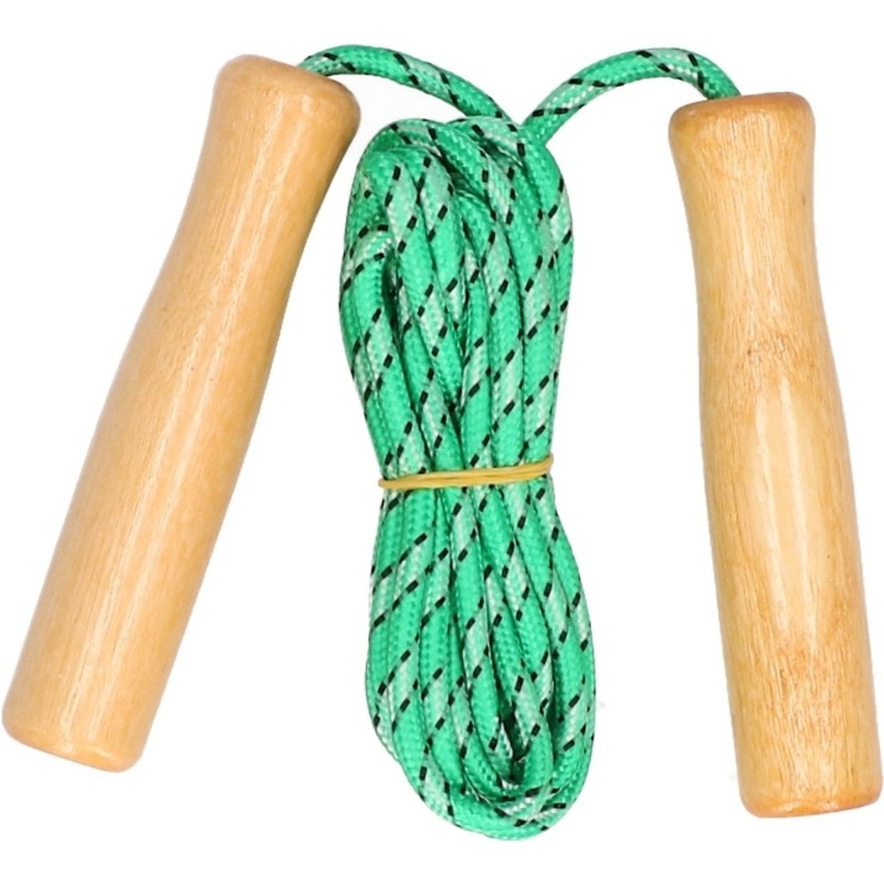 Dit groene springtouw is ideaal voor kinderen, jongens, meisjes en volwassenen die graag buiten actief zijn. Met een totale lengte van 236 cm en houten handvatten biedt het springtouw comfort en grip. De gekleurde streepjes kunnen afwijken van de foto, maar de hoofdkleur blijft groen. Gemaakt van duurzaam polyester en hout, perfect voor buitenspeelgoed en sportief vermaak. Eenvoudig in gebruik en geschikt voor allerlei spring- en speelsessies.