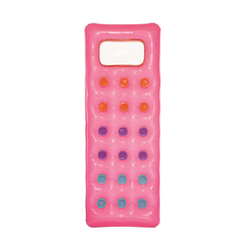 Roze luchtbed met doorschijnend hoofdkussen. Geniet van ultieme ontspanning op het water met dit stijlvolle rozee luchtbed. Perfect voor in het zwembad, op zee of gewoon om te zonnen op het strand. Het luchtbed is voorzien van vrolijke gekleurde stippen en een comfortabel, transparant hoofdkussen voor extra ondersteuning.
