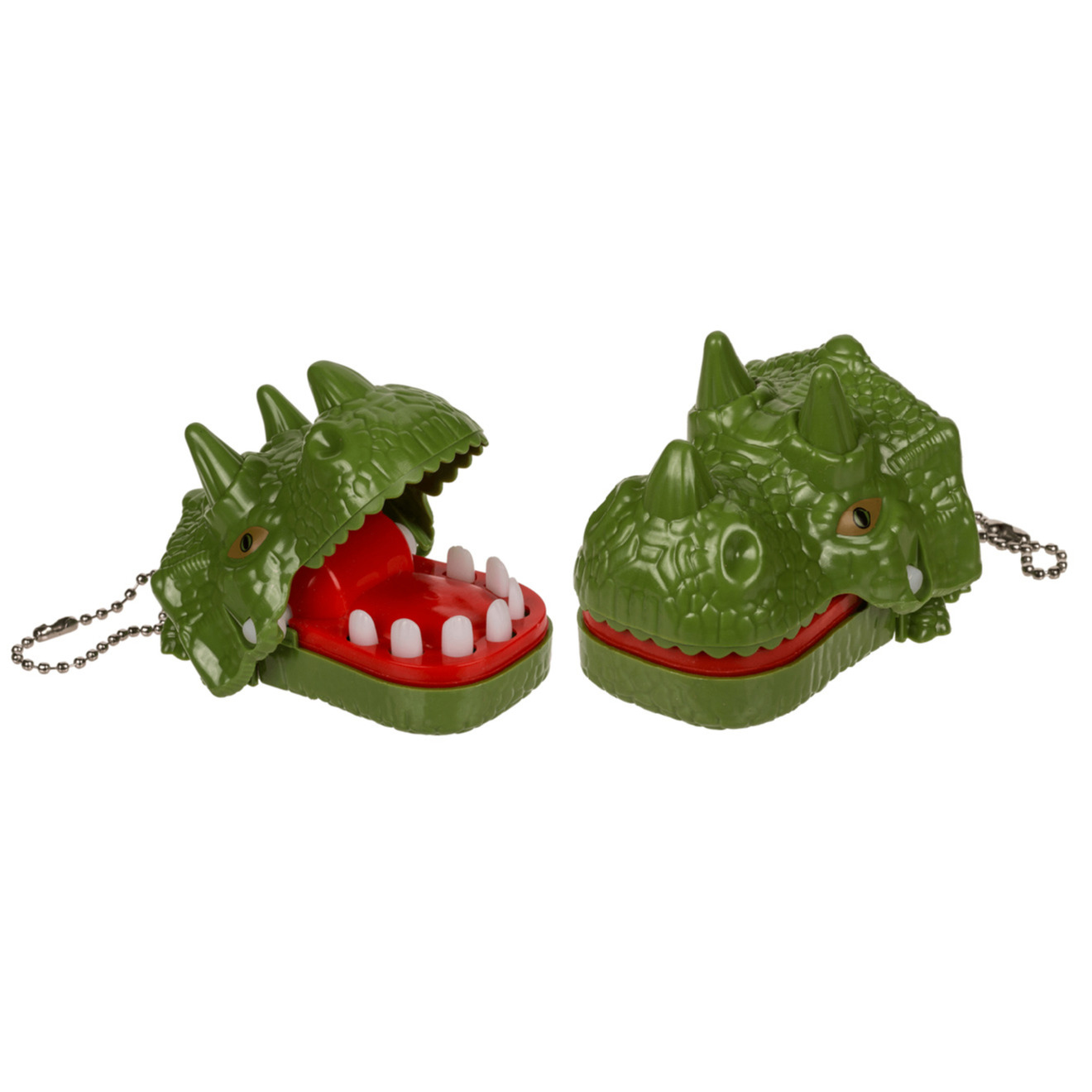 2x bijtende dinosaurus met kiespijn spel, in een mini editie. Handig voor op reis of onderweg. Spannend spel voor de vrienden of familie. Druk een voor een zijn tanden in, maar pas op dat de kleine dinosaurus niet in je vingers bijt! Leuk als familie spel, als drank spelletje, of op een vrijgezellenfeestje. Formaat: ca. 8 x 5 x 5 cm.
