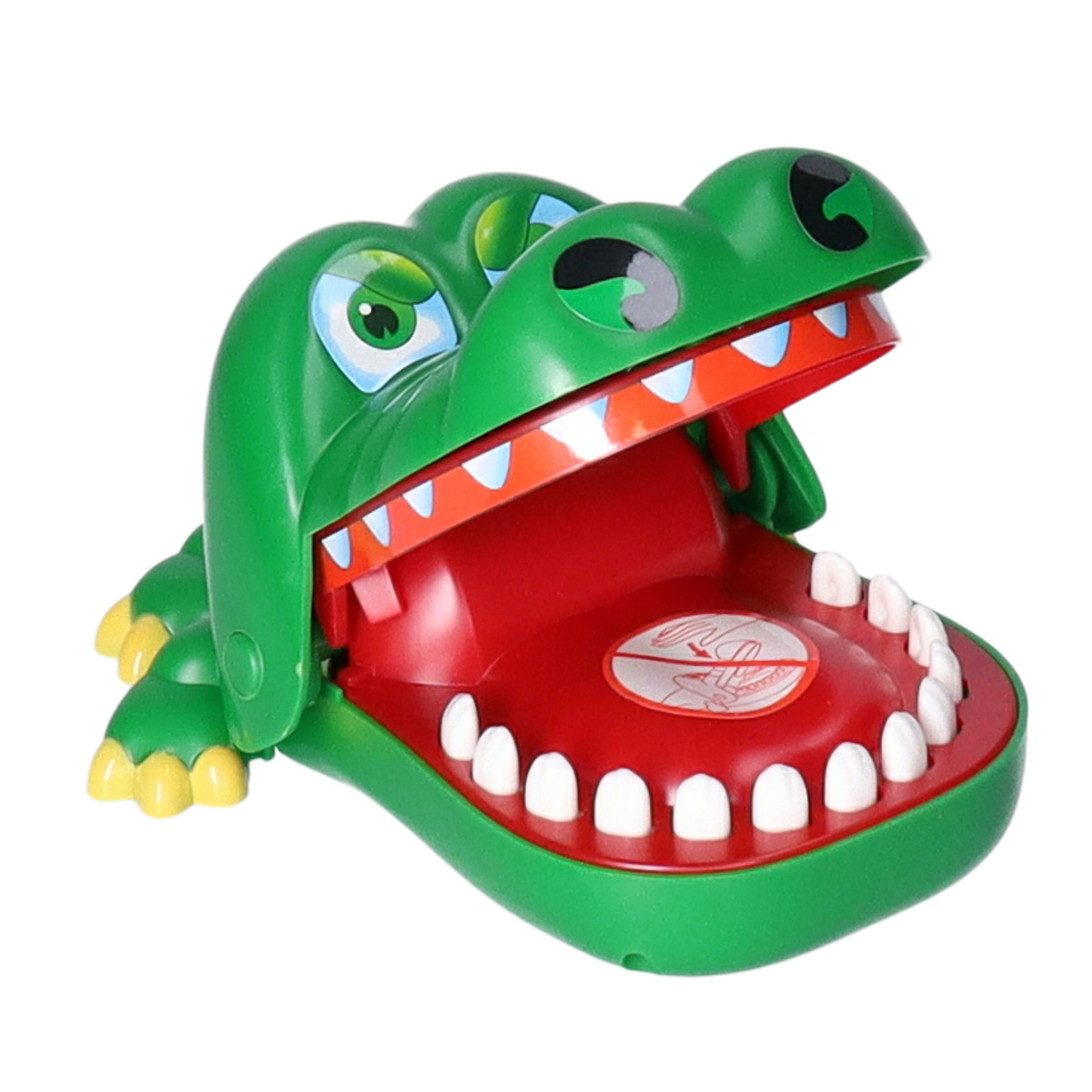 Bijtende krokodil spel. Spannend spel voor de vrienden of familie. Pas op dat de kleine krokodil niet in je vingers bijt! Leuk als familie spel, als drank spelletje, of op een vrijgezellenfeestje. Deze krokodil heeft pijn aan ??n tand, maar welke tand is dat dan? Druk al zijn tanden stuk voor stuk naar beneden en je komt er snel genoeg achter! Maar let wel op, want de krokodil kan zomaar zijn bek dicht klappen en dan heb jij het spel verloren! Speelplezier voor jong en oud. Materiaal: kunststof. Afmetingen: L15 x B12 x H8 cm.