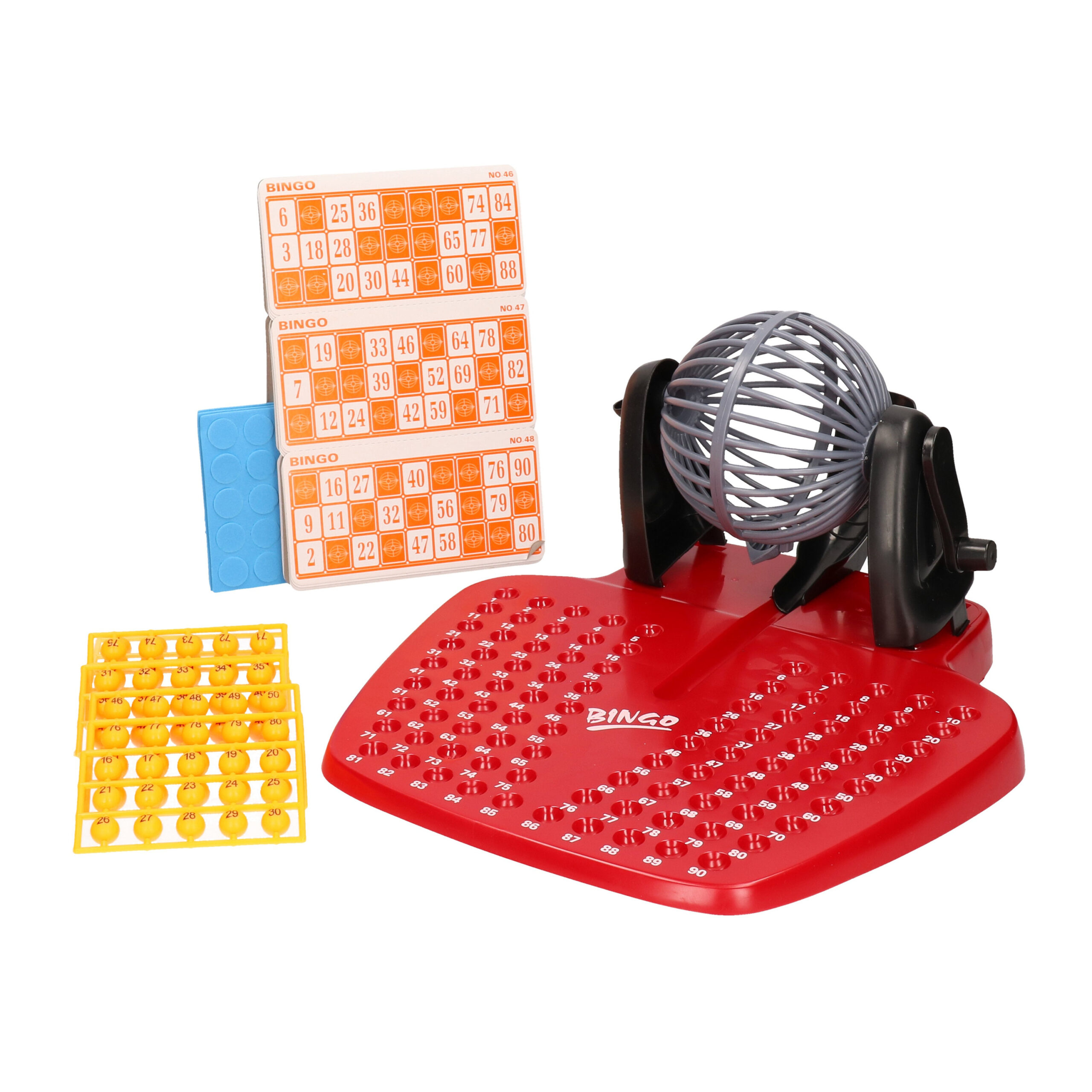 Bingo spel rood/oranje complete set nummers 1-90 met molen, fiches en bingokaarten. Compleet bingospel, bestaande uit: een bingomolen met sorteerbord/controlebord, 90x oranje balletjes, fiches en 48x bingo speelkaarten. Afmeting verpakking: 28 x 29 x 3.5 cm.
