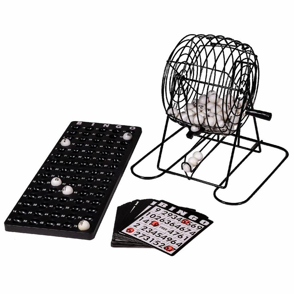 Bingo spel zwart/wit complete set 29 cm nummers 1-75 met molen en bingokaarten. Compleet bingospel, bestaande uit: een metalen bingomolen met sorteerbord/controlebord, 75x witte balletjes, 18x bingo speelkaarten en 150x fiches om op de speelkaarten te leggen. U kunt de kaarten hergebruiken omdat u er fiches op legt in plaats van deze aan te strepen met een stift. Eventueel gewenste bingostiften en extra bingokaarten niet inbegrepen, maar wel los verkrijgbaar in deze webshop.