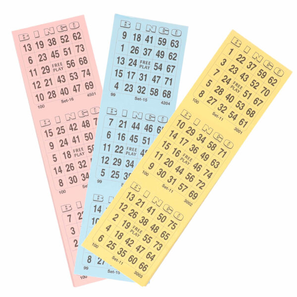 5x Bingokaarten nummers 1-75. Gekleurd blok met 100x bingokaarten. Op elk van de 100 vellen staan 3 spellen. Let op! U ontvangt een blok kaarten in een willekeurige kleur.