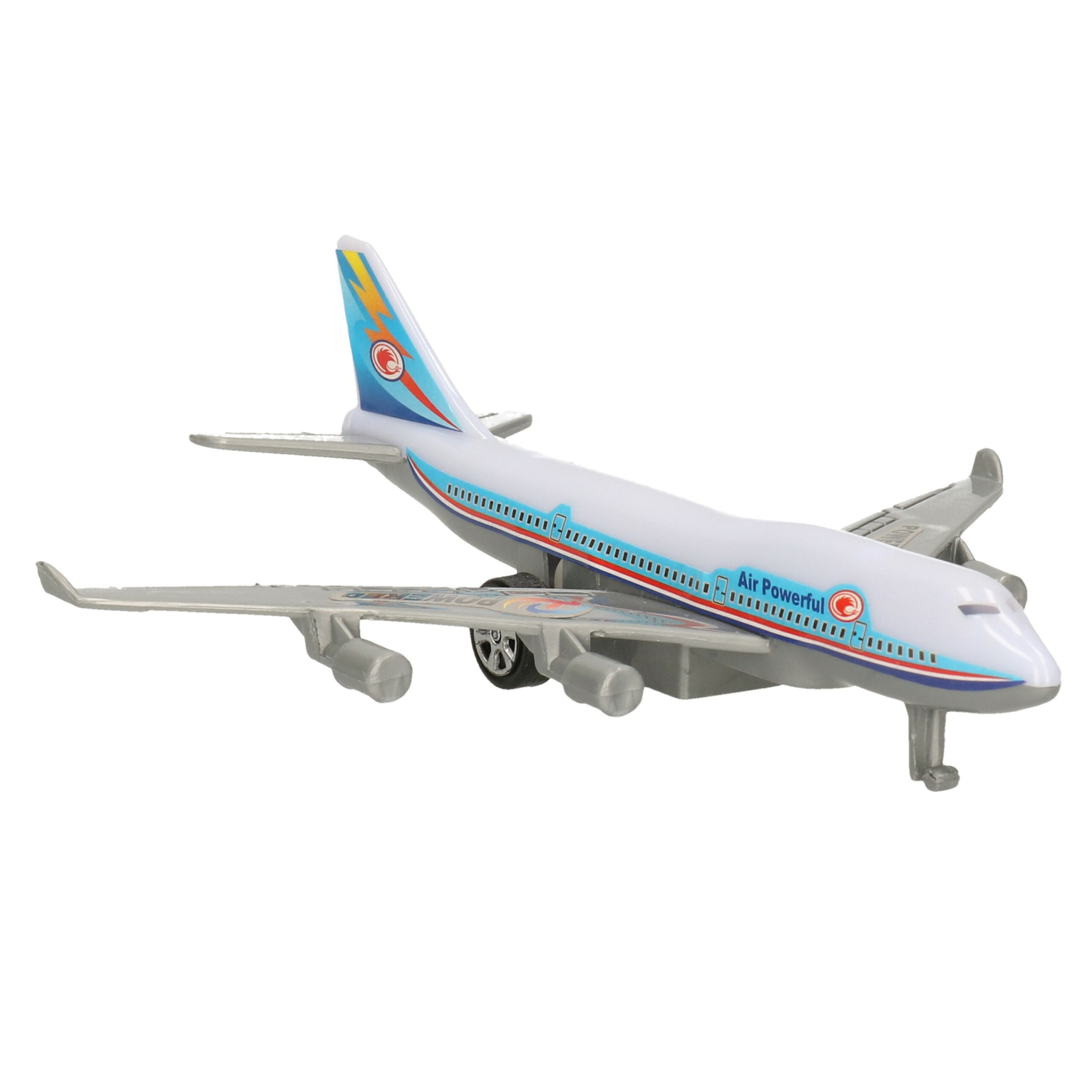Blauw/wit speelgoed vliegtuig met pull-back functie 14 cm. Een speelgoed vliegtuigje met draaibare wielen. Zet het vliegtuig op de grond, trek deze duwend naar achter en laat los. Het vliegtuig zal nu naar voren schieten.