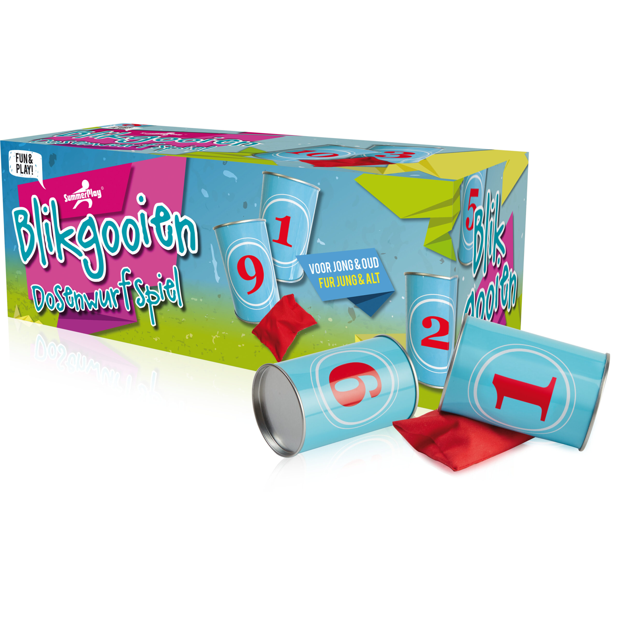 Blikken gooien speelset. Uren speelplezier met dit oer-Hollandse spel. Deze blikken gooien speelgoed set bestaat uit 10 blikken en 3 werpzakjes.