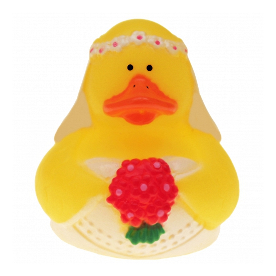 Bruid badeend. Badeendje die aangekleed is als een bruid. Leuk voor de kleine in bad, maar natuurlijk ook voor de verzamelaar, of voor degene die gaat trouwen. Geschikt voor kinderen vanaf 1 jaar. Ongeveer 5 cm groot. Bruiloft thema feestartikelen.