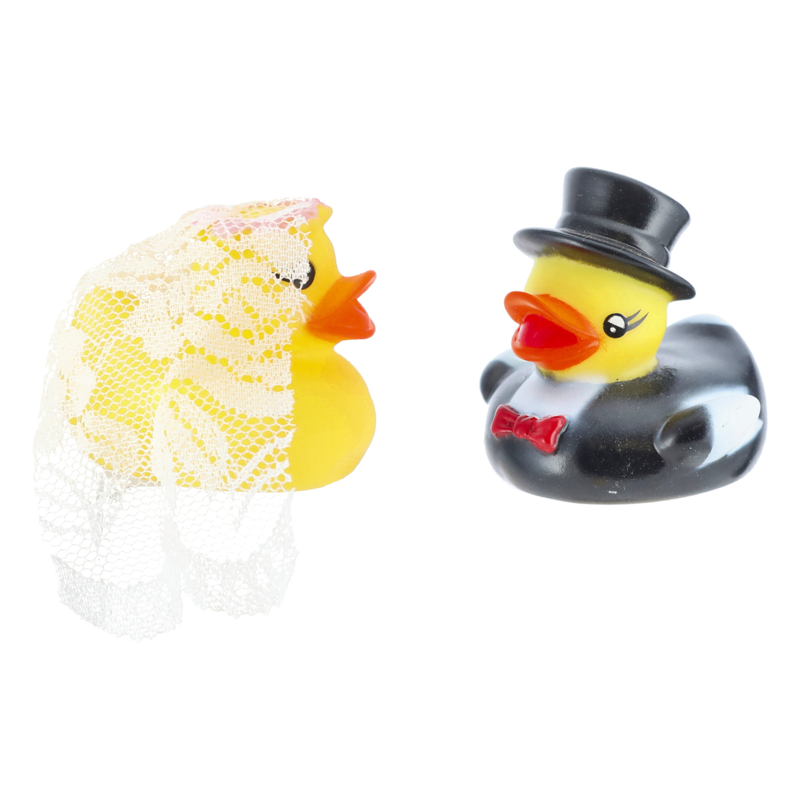 Bruidegom en Bruid badeendjes set. Badeendjes die aangekleed zijn als bruid en bruidegom. Leuk voor de kleine in bad, maar natuurlijk ook voor de verzamelaar, of degene die gaat trouwen. Geschikt voor kinderen vanaf 3 jaar. Ongeveer 5 cm groot. Bruiloft feestartikelen.