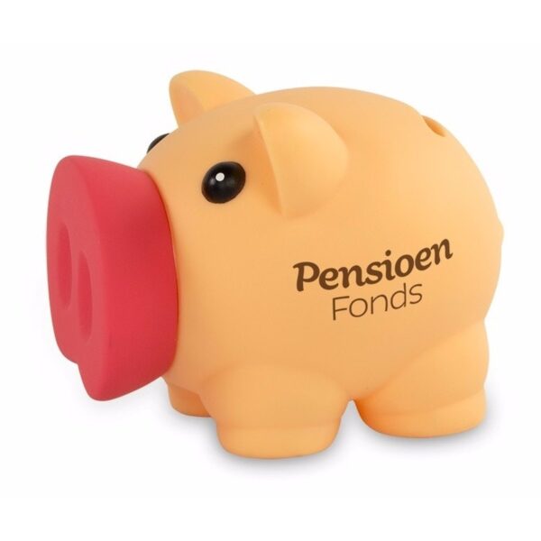 Spaarvarken of spaarpot met tekst: Pensioenfonds. De donkerroze snuit van het Spaarvarkentje is de dop en eenvoudig afneembaar. Het Spaarvarkentje is gemaakt van PVC en silicone en is ongeveer 10 cm lang, 7,2 cm hoog en 8 cm diep. Het product is succesvol CE-getest en mag daarmee de certificering dragen voor kind-veilig speelgoed.
