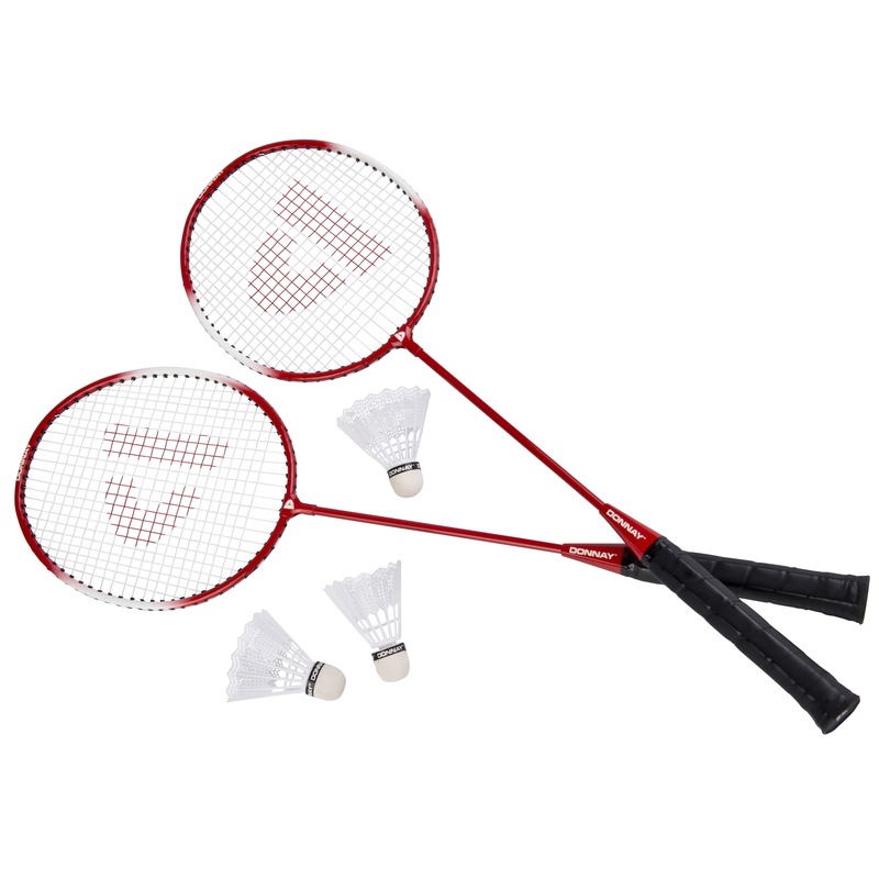 Badminton set rood 6-delig. Deze voordelige badminton set van Donnay wordt geleverd met 2 rackets, 3 shuttles en een opbergtas (niet afgebeeld). Formaat racket: ongeveer 67 x 25 cm. Badminton rackets en shuttles set voor op reis/camping/vakantie.