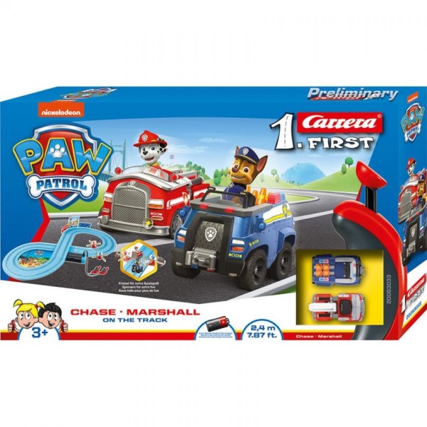 Laat de hondjes Chase en Marshall tegen elkaar racen met de Carrera Racebaan First Paw Patrol 240cm! Je kunt de hondjes besturen met de handregelaar, zodat ze niet uit de bocht vliegen of tegen elkaar op botsen. De baan heeft een vorm van een achtje…