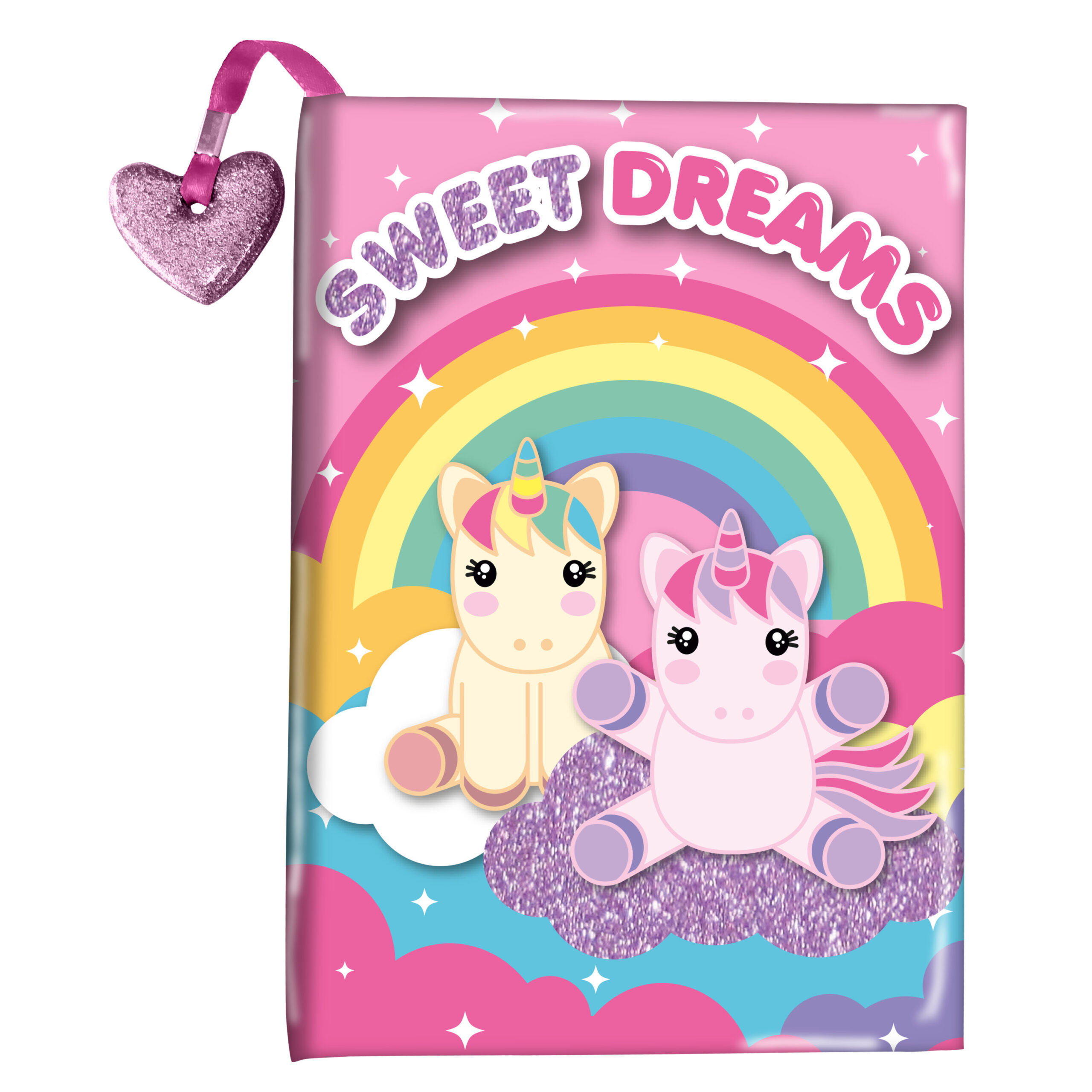 Dagboek Sweet Dreams unicorns met glitter. Dagboekje met print van 2 eenhoorns elk op een wolkje. Aan het dagboek hangt een paars glitterhartje aan een lintje. Dankzij het slotje zijn je geheimen veilig!
