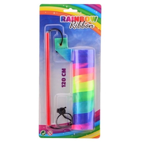 Gymnastiek lint in regenboog kleuren 120 cm. Laat kinderen dansen, zwaaien en zwieren met dit vrolijke gymnastieklint in regenboogkleuren! Het lange lint is bevestigd aan een handstokje van ca. 50 cm en beweegt sierlijk door de lucht ? perfect voor gym, dans, spelletjes of creatieve expressie.