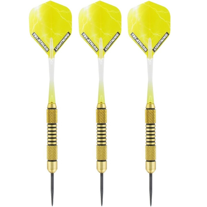 Set van 3x dartpijlen Speedy Yellow Brass 19 grams. Dartpijlen met een messing (Brass) barrel, een PVC shaft, stalen punt en wordt standaard geleverd met Metallic Lightning flites. Door de ringgrip barrel heeft deze pijl een goede grip. Een set bevat 3x complete darts.