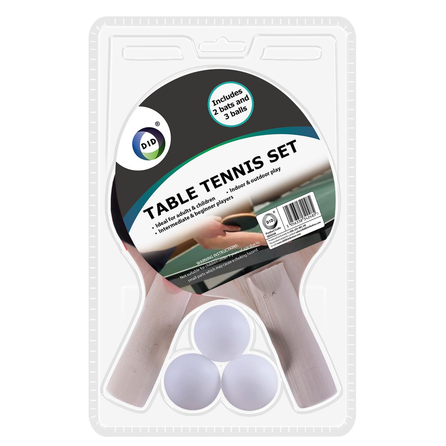DID Tafeltennis set bestaande uit 2x houten tafeltennisbatjes en 3x plastic pingpong ballen. Zoek een tafeltennis tafel, pak deze batjes en begin met spelen. PingPong spelen is voor kinderen en volwassenen. Binnen en buitenspeelgoed.