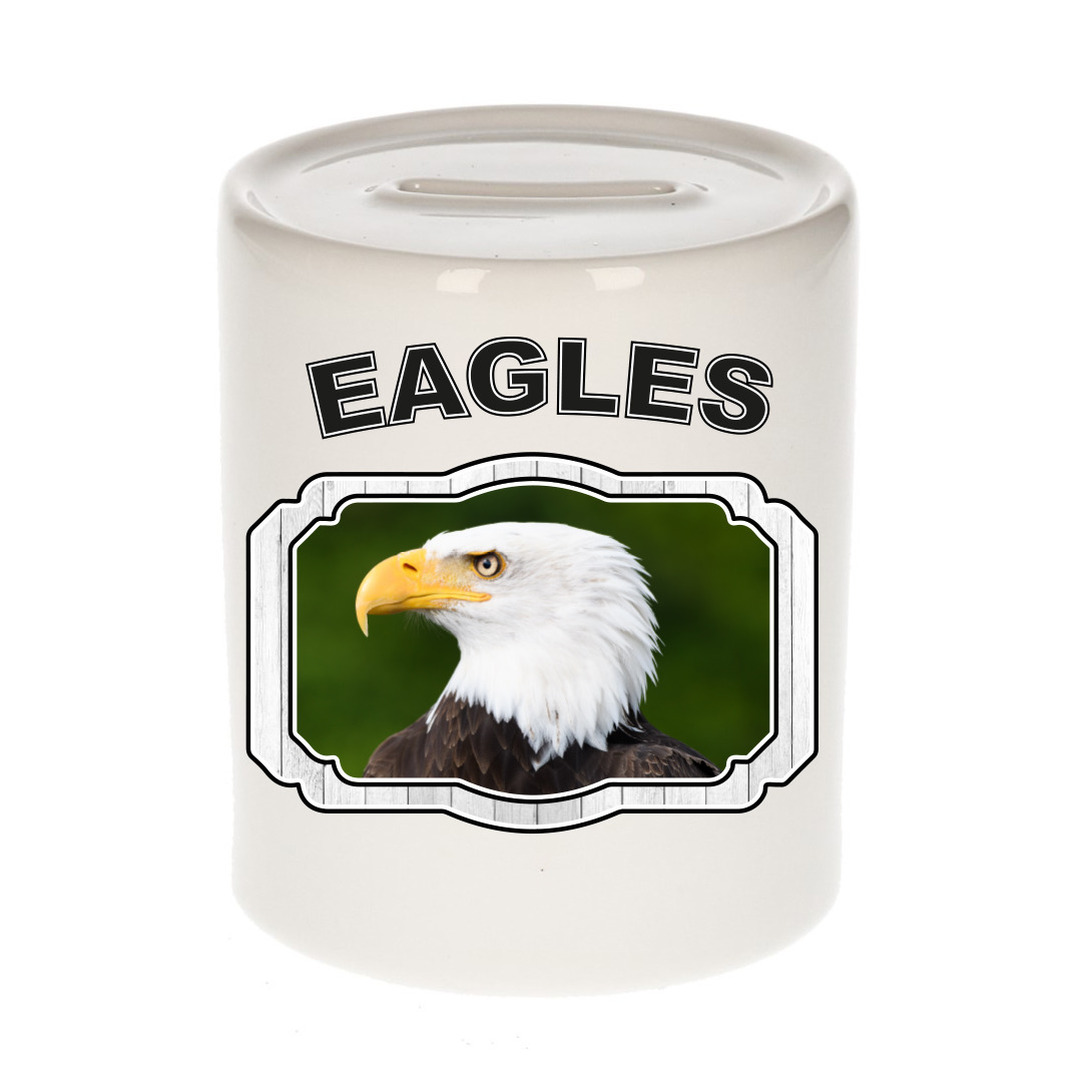 Dieren arend spaarpot – eagles spaarpot jongens en meisjes 9 cm. Deze witte spaarpot is tweezijdig bedrukt met een zeearend afbeelding en de tekst: eagles. Een musthave voor een echte dieren/ zeearenden liefhebber of iemand die alles van zeearenden spaart. Erg leuk om cadeau te doen aan een echte zeearenden fan!
