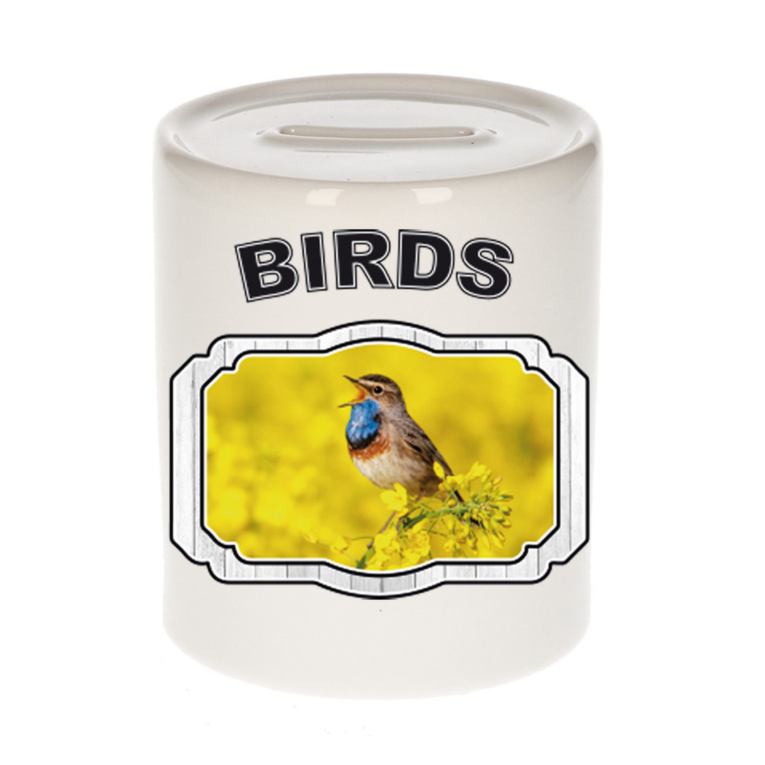 Dieren blauwborst vogel spaarpot – birds spaarpot jongens en meisjes 9 cm. Deze witte spaarpot is tweezijdig bedrukt met een vogels afbeelding en de tekst: birds. Een musthave voor een echte dieren/ vogels liefhebber of iemand die alles van vogels spaart. Erg leuk om cadeau te doen aan een echte vogels fan!