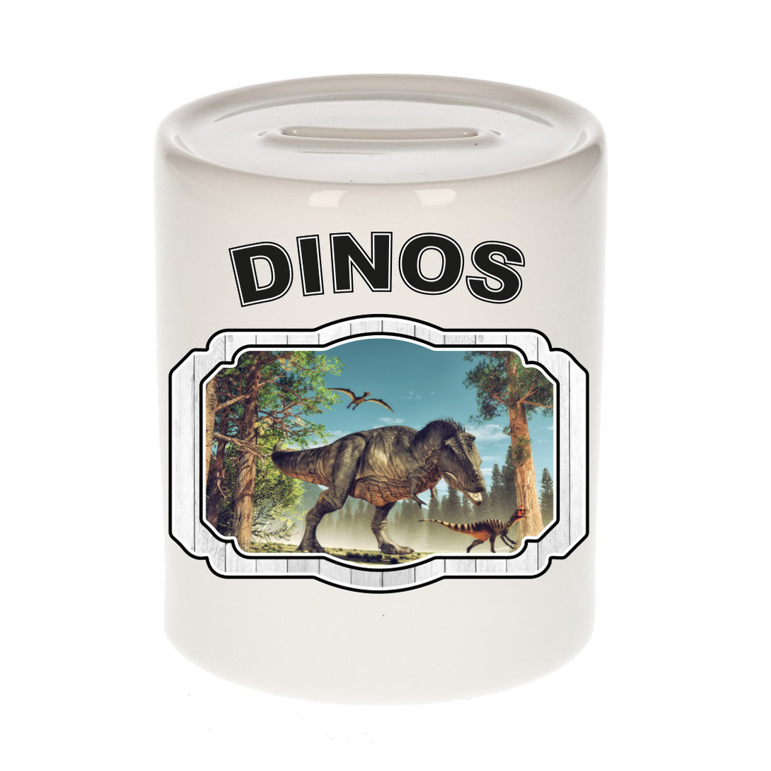 Dieren dinosaurus t-rex spaarpot – dinosaurs spaarpot jongens en meisjes 9 cm. Deze witte spaarpot is tweezijdig bedrukt met een dinosaurus afbeelding en de tekst: dinosaurs. Een musthave voor een echte dieren/ dinosaurussen liefhebber of iemand die alles van dinosaurussen spaart. Erg leuk om cadeau te doen aan een echte dinosaurussen fan!