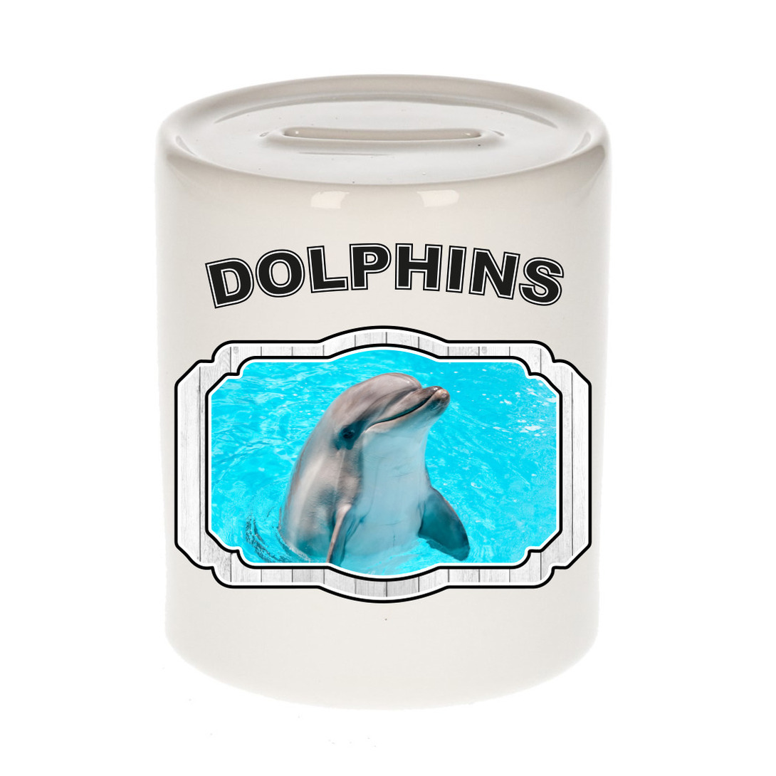 Dieren dolfijn spaarpot – dolphins spaarpot jongens en meisjes 9 cm. Deze witte spaarpot is tweezijdig bedrukt met een dolfijnen afbeelding en de tekst: dolphins. Een musthave voor een echte dieren/ dolfijnen liefhebber of iemand die alles van dolfijnen spaart. Erg leuk om cadeau te doen aan een echte dolfijnen fan!