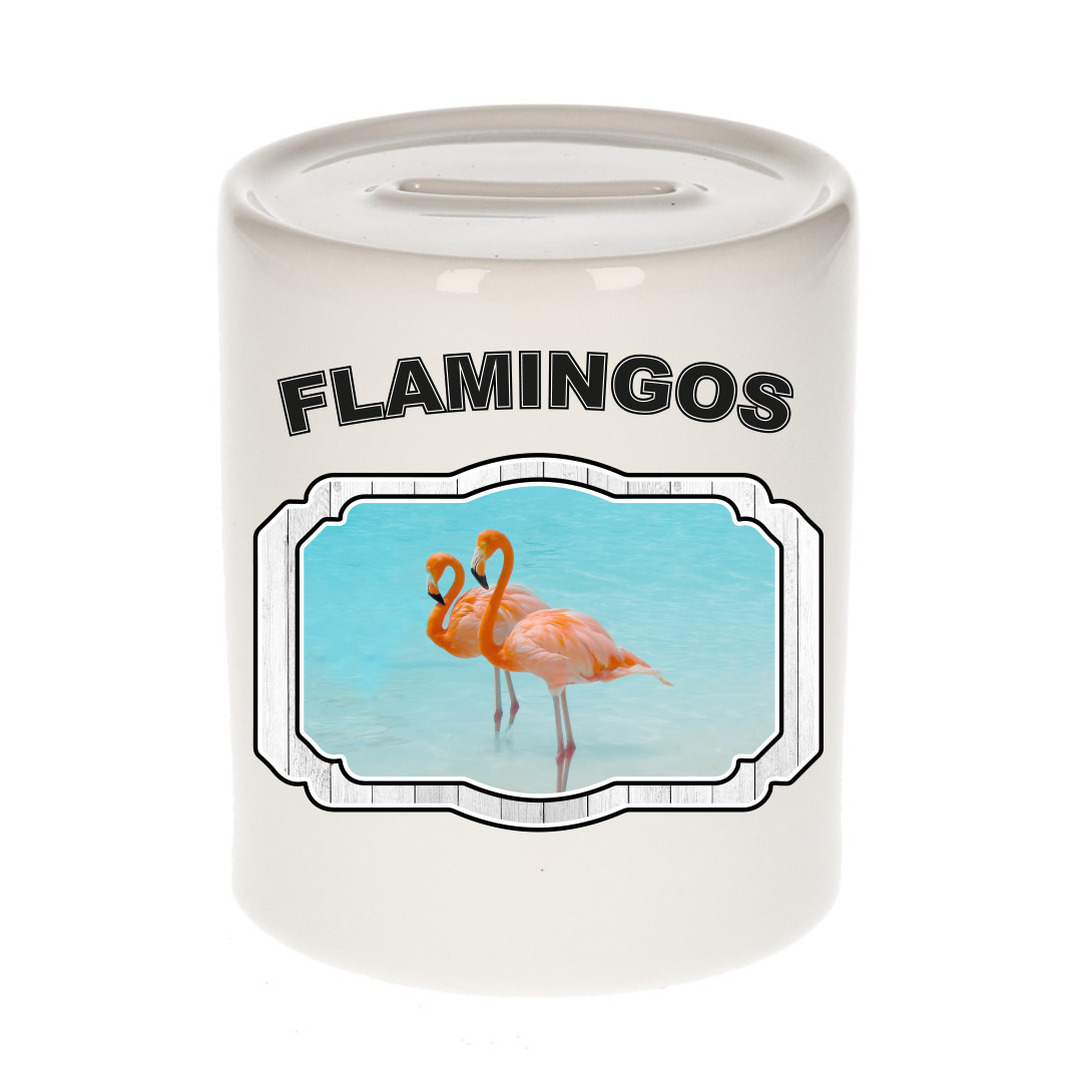 Dieren flamingo spaarpot – flamingos spaarpot jongens en meisjes 9 cm. Deze witte spaarpot is tweezijdig bedrukt met een flamingo vogels afbeelding en de tekst: flamingos. Een musthave voor een echte dieren/ flamingo vogels liefhebber of iemand die alles van flamingo vogels spaart. Erg leuk om cadeau te doen aan een echte flamingo vogels fan!