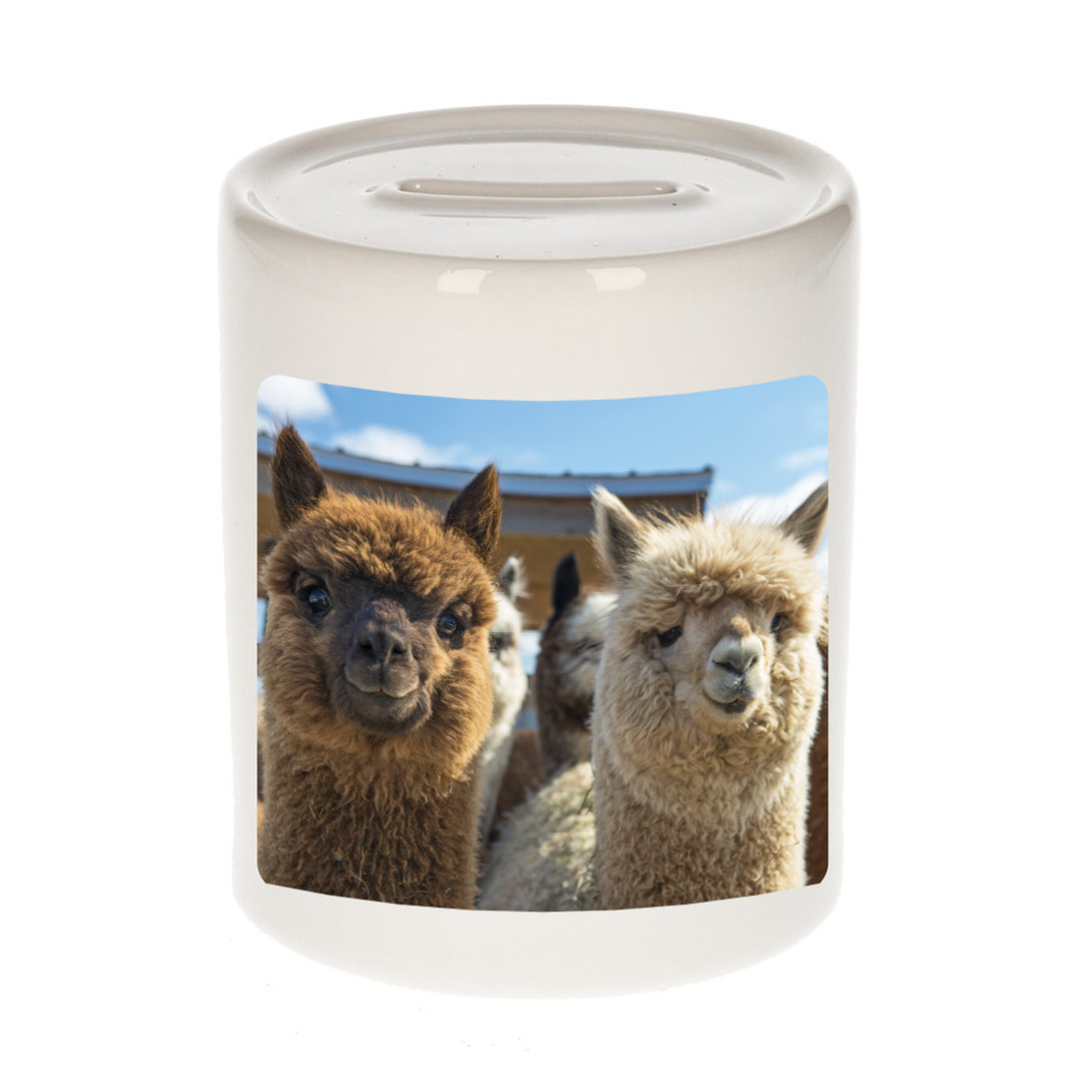Dieren foto spaarpot alpaca wit 9 cm. Deze spaarpot is aan twee kanten bedrukt met een mooie alpaca foto. Een musthave voor een echte dieren/ alpacas liefhebber of iemand die alles van alpacas spaart. Erg leuk om cadeau te doen aan een echte alpacas fan!