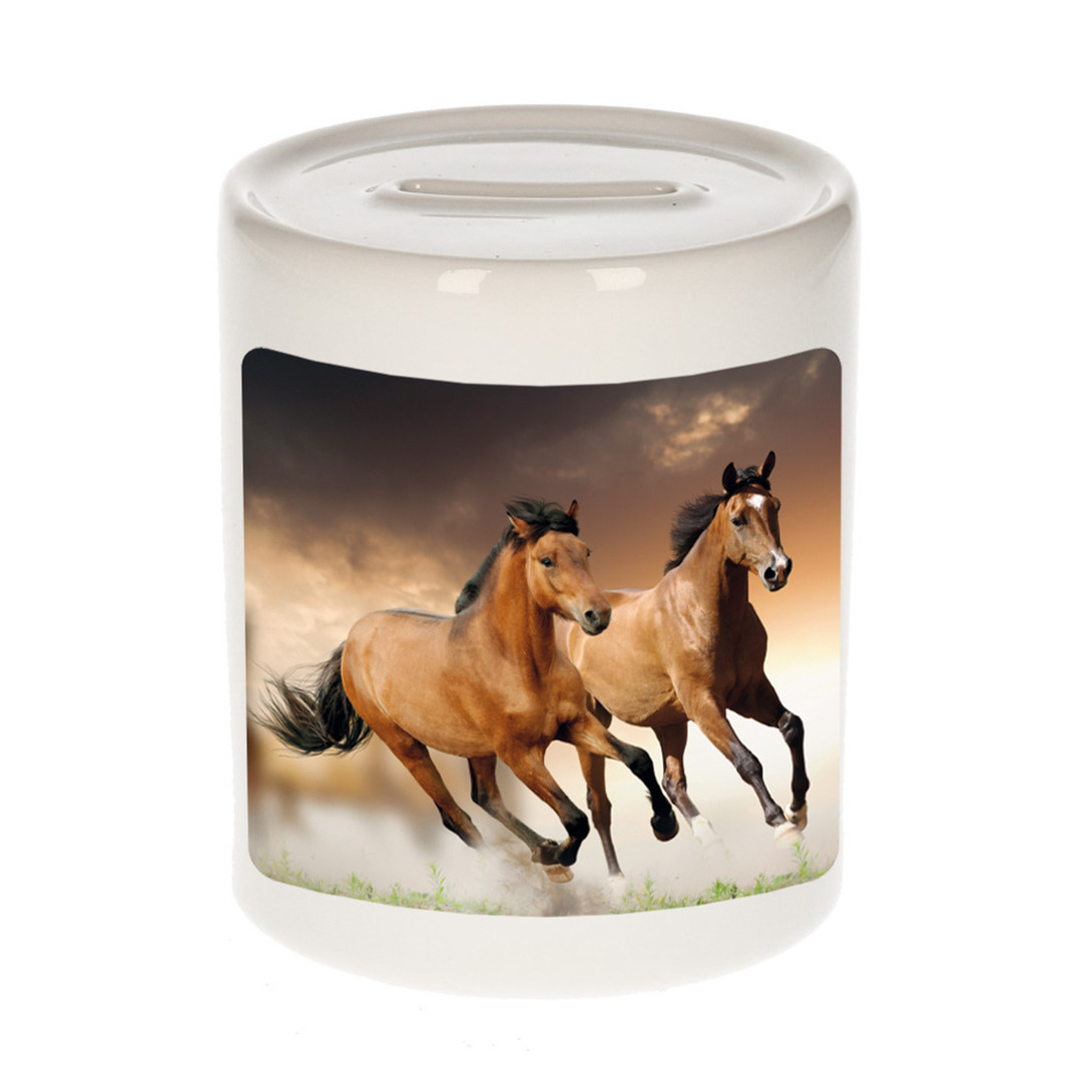 Dieren foto spaarpot bruin paard wit 9 cm. Deze spaarpot is aan twee kanten bedrukt met een mooie bruin paard foto. Een musthave voor een echte dieren/ paarden liefhebber of iemand die alles van paarden spaart. Erg leuk om cadeau te doen aan een echte paarden fan!