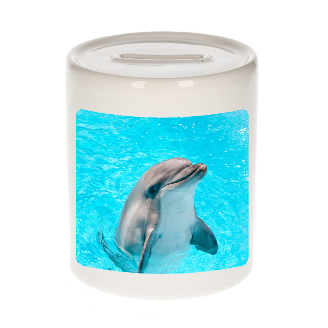 Dieren foto spaarpot dolfijn wit 9 cm. Deze spaarpot is aan twee kanten bedrukt met een mooie dolfijn foto. Een musthave voor een echte dieren/ dolfijnen liefhebber of iemand die alles van dolfijnen spaart. Erg leuk om cadeau te doen aan een echte dolfijnen fan!