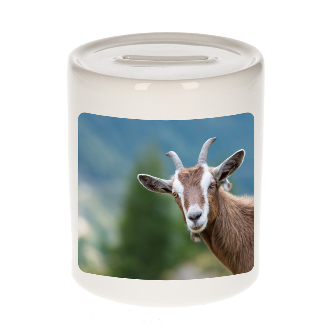 Dieren foto spaarpot geit wit 9 cm. Deze spaarpot is aan twee kanten bedrukt met een mooie geit foto. Een musthave voor een echte dieren/ geiten liefhebber of iemand die alles van geiten spaart. Erg leuk om cadeau te doen aan een echte geiten fan!