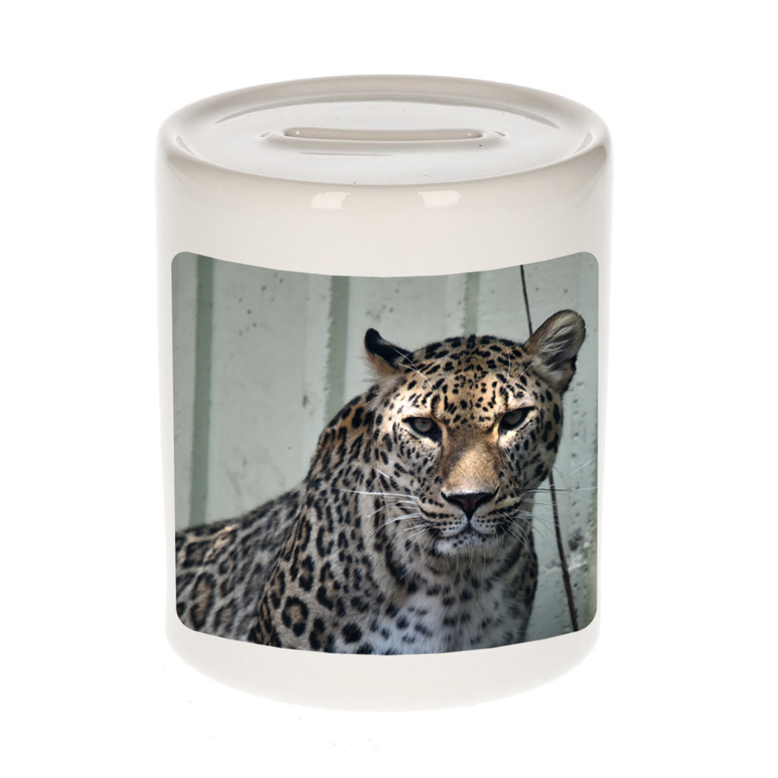 Dieren foto spaarpot gevlekte jaguar wit 9 cm. Deze spaarpot is aan twee kanten bedrukt met een mooie gevlekte jaguar foto. Een musthave voor een echte dieren/ jaguars liefhebber of iemand die alles van jaguars spaart. Erg leuk om cadeau te doen aan een echte jaguars fan!