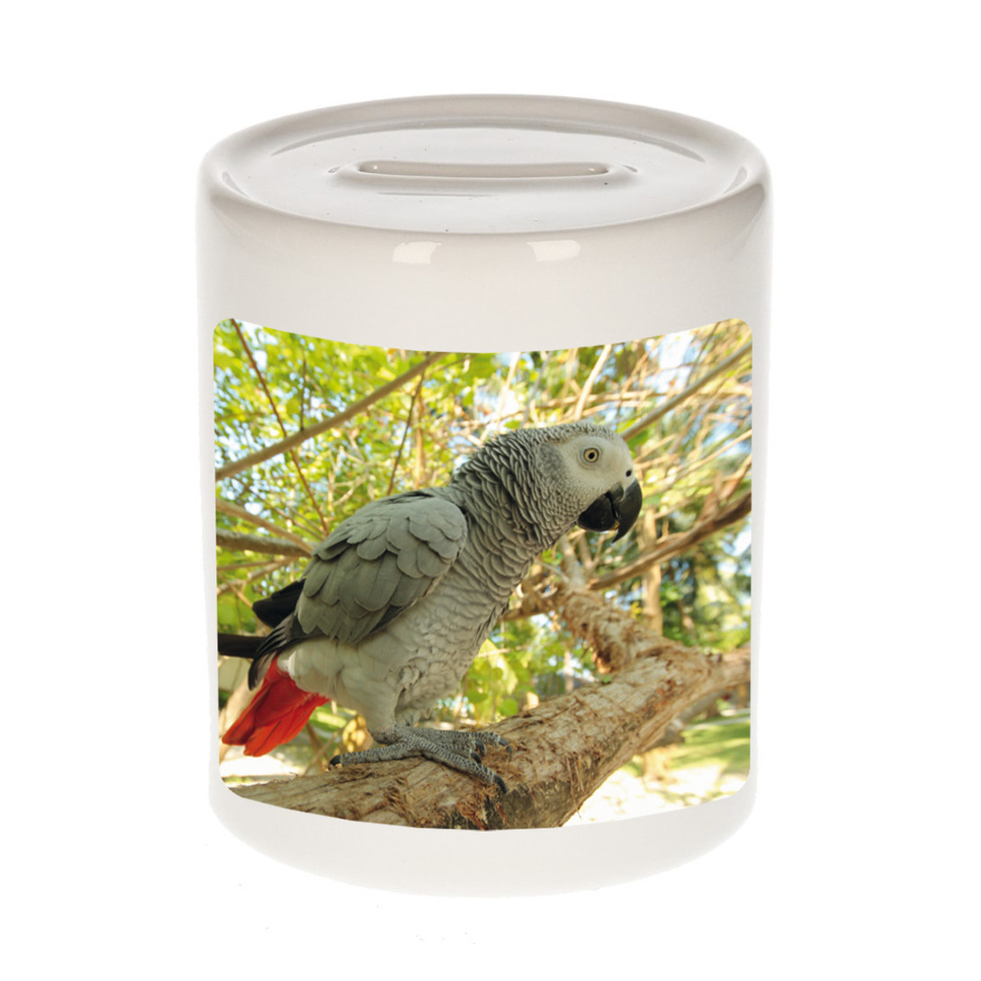 Dieren foto spaarpot grijze roodstaart papegaai wit 9 cm. Deze spaarpot is aan twee kanten bedrukt met een mooie grijze roodstaart papegaai foto. Een musthave voor een echte dieren/ papegaaien liefhebber of iemand die alles van papegaaien spaart. Erg leuk om cadeau te doen aan een echte papegaaien fan!
