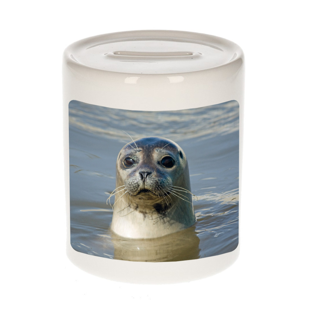 Dieren foto spaarpot grijze zeehond wit 9 cm. Deze spaarpot is aan twee kanten bedrukt met een mooie grijze zeehond foto. Een musthave voor een echte dieren/ zeehonden liefhebber of iemand die alles van zeehonden spaart. Erg leuk om cadeau te doen aan een echte zeehonden fan!