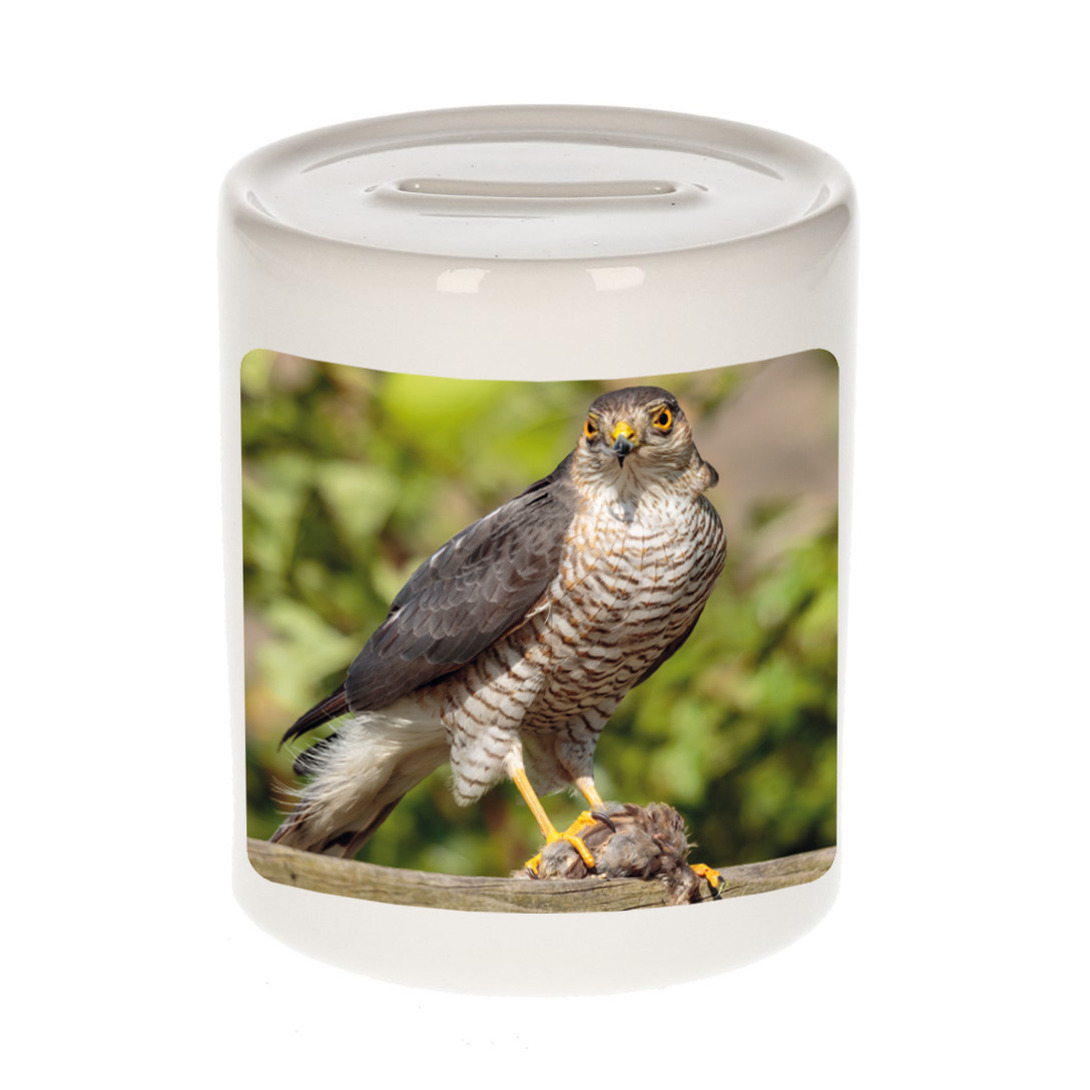 Dieren foto spaarpot havik roofvogel wit 9 cm. Deze spaarpot is aan twee kanten bedrukt met een mooie havik roofvogel foto. Een musthave voor een echte dieren/ roofvolgel liefhebber of iemand die alles van roofvolgel spaart. Erg leuk om cadeau te doen aan een echte roofvolgel fan!