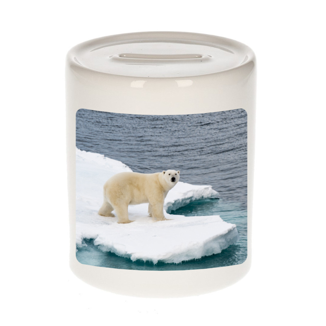 Dieren foto spaarpot ijsbeer wit 9 cm. Deze spaarpot is aan twee kanten bedrukt met een mooie ijsbeer foto. Een musthave voor een echte dieren/ ijsberen liefhebber of iemand die alles van ijsberen spaart. Erg leuk om cadeau te doen aan een echte ijsberen fan!
