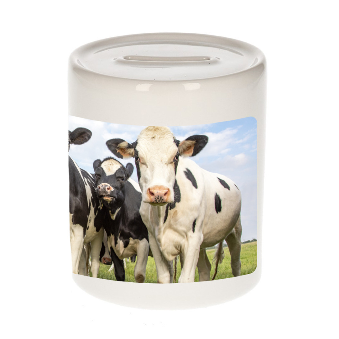 Dieren foto spaarpot koe wit 9 cm. Deze spaarpot is aan twee kanten bedrukt met een mooie koeien foto. Een musthave voor een echte dieren/ Nederlandse koeien liefhebber of iemand die alles van koeien spaart. Erg leuk om cadeau te doen aan een echte koeien fan!